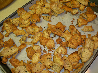 3. Toss these torn pita pieces in a bowl with 1/2 cup oil (I used safflower oil, but you can use olive oil). Get some salad tongs and toss them until well-covered with oil. Might be able to get away with only 1/3 cup of oil, which I'll try next time. Less oil is a good thing.
